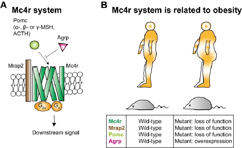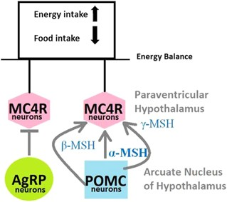 MC4R’nin POMC’den üretilen yüksek afiniteli ligand olan alfa melonosit stimulan hormon (α-MSH) ile bağlanmasının beslenmeyi inhibe ettiğini göstermektedir