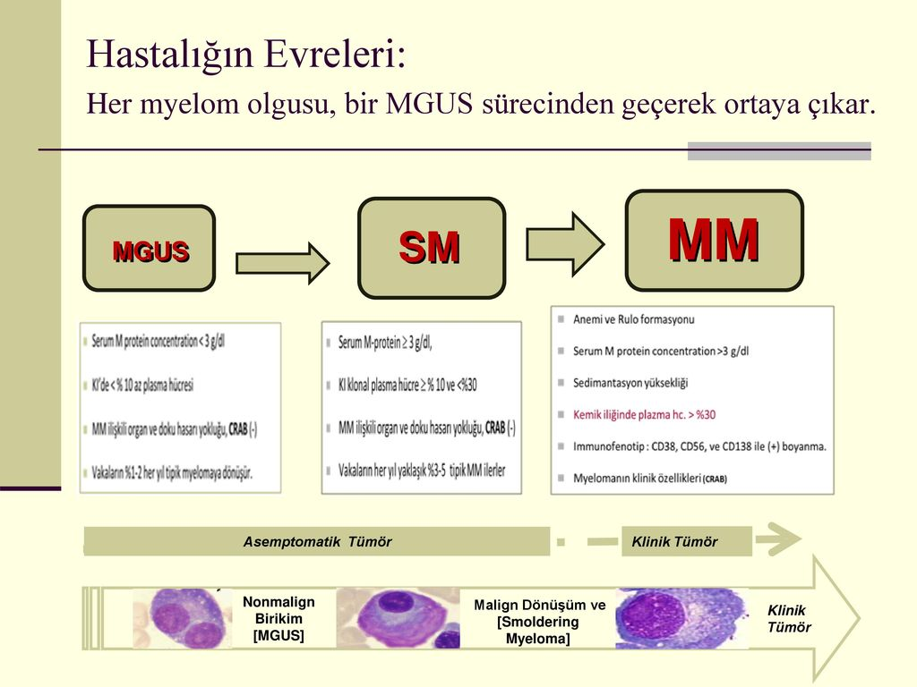 Kemik iliği klonal plazma hücre oranı ≥%10 olmalı veya biyopsi ile kanıtlanmış kemik kaynaklı veya ekstramedüller plazmasitom olmalı ve miyelom tanımlayıcı olay varlığı ( En az bir veya daha fazla CRAB belirti veya bulgusunun olması veya en az bir veya daha fazla SLiM kriterinin bulunması) gereklidir.