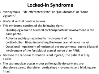 Locked-in sendromu genellikle baziler arter tıkanmasına bağlı olarak pons ventral kısmının infarktı ile gelişir. Karakteristik bulguları kuadripleji, kranial sinir felçleri ve mutizm olup yalnızca vertikal göz hareketleri korunmuştur.