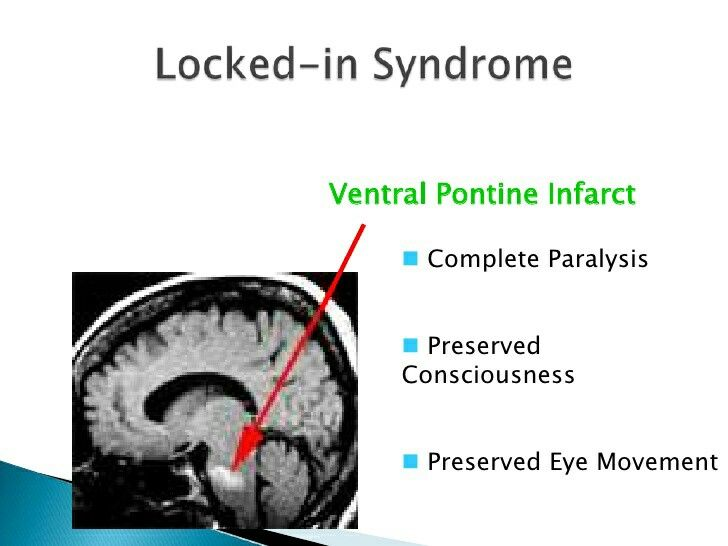 Kilitli kalma sendromudur. Hastanın bilinci açıktır, çevresini duyabilir fakat sadece göz hareketleriyle iletişim kurar.