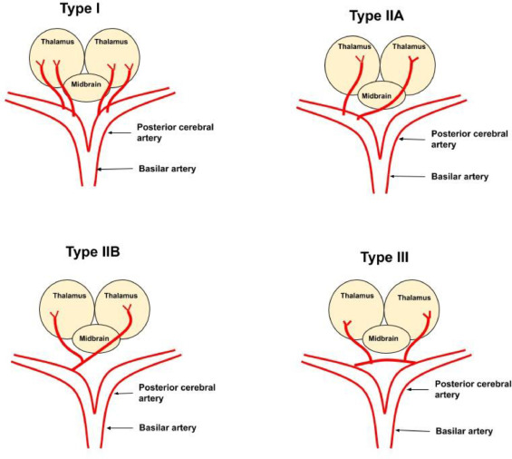 Sayı, genişlik ve besledikleri alan açısından farklılıklar gösteren talamoperforan arterler bazen bir taraftaki posterior serebral arterden tek bir kökle çıkar ve iki taraf paramedian bölgeyi besler. Bu anatomik varyant Percheron arteri olarak isimlendirilir ve bu arterin tıkanıklığı bilateral paramedian talamik infarkta neden olur.