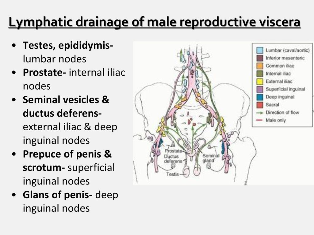 Ductus deferens’den gelen lenf damarlan nodi iliaci exter- ni’de, vesicula seminalis’ten gelen lenf damarlan ise nodi iliaci interni ve nodi iliaci externi’de sonlanırlar.