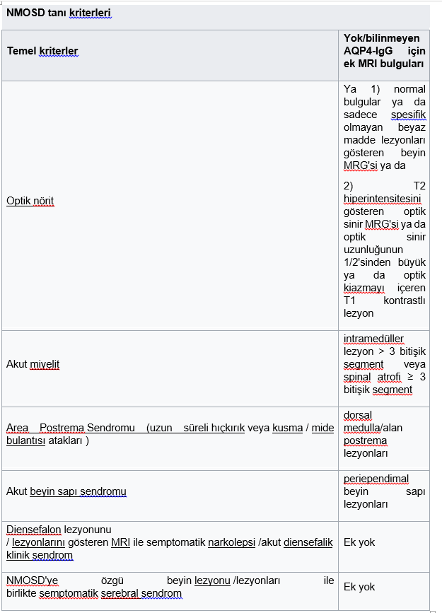 AQP4-IgG tespit edilmezse veya durumu bilinmiyorsa, NMOSD tanısı için her biri destekleyici MRI bulgularına sahip iki temel klinik kriterin yanı sıra alternatif tanıların dışlanması gerekir.