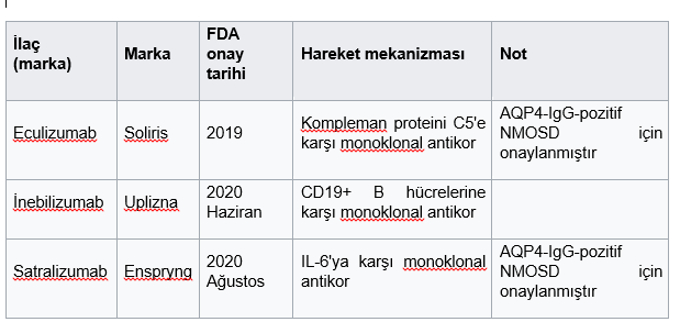 AQP4-IgG-pozitif NMOSD’ye karşı FDA onaylı, faz III klinik çalışmalarda etkili olduğu gösterilen ilaçlar ilk kez 2019’da kullanıma sunuldu. 2020 yılı itibarıyla dünya çapında en pahalı ilaçlar arasında yer alıyorlar. Hap formunda mevcut değiller, bu da yüksek fiyatlarının yanı sıra erişilebilirliklerini sınırlıyor. Bu yeni ilaçların AQP4-IgG-negatif NMOSD’ye karşı etkinliği bilinmemektedir.
