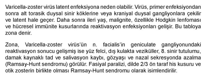 Vakaların yaklaşık % 10-20 sinde VZV, bu kişilerin sonraki yaşamlarında reaktive olur ve zona olarak bilinen hastalığı oluşturur.