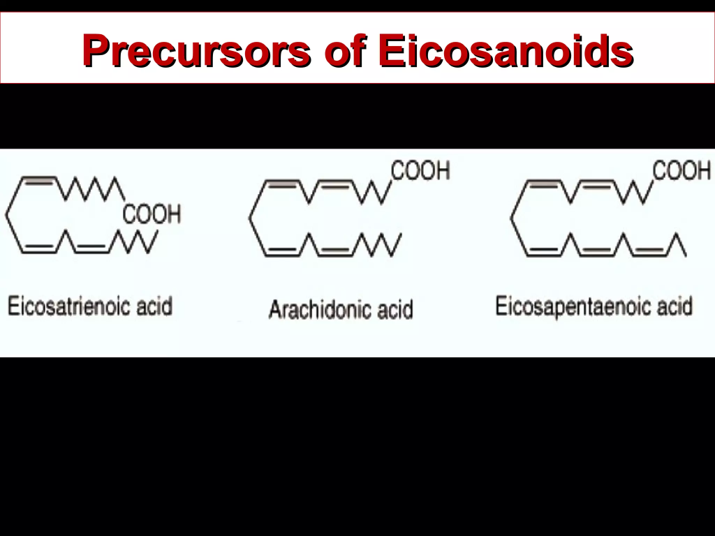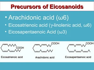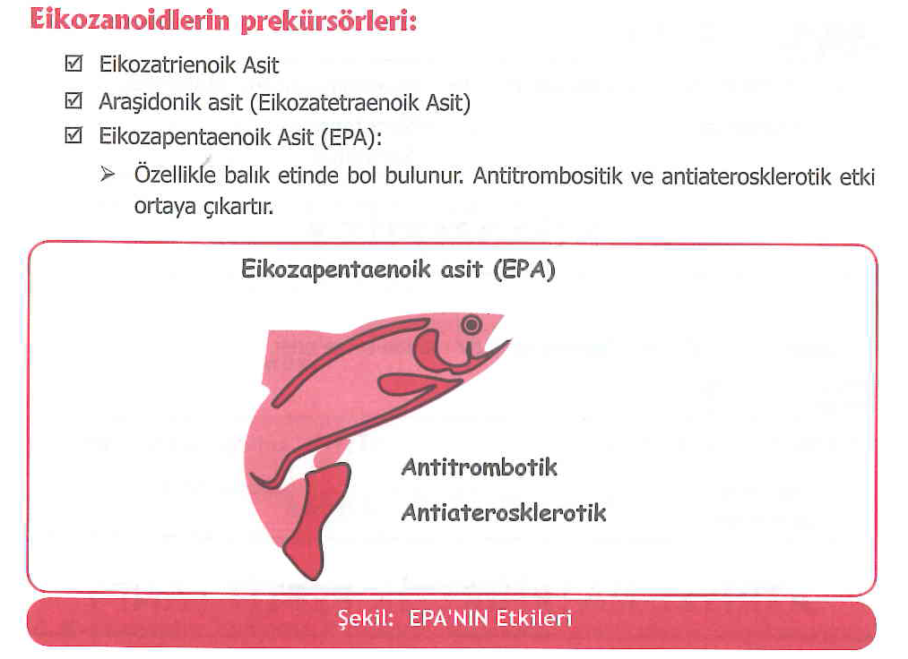 ALA ve LA , esas olarak bitkilerden elde edilen eikosanoidlerin ana öncüleridir. Spesifik enzimlerin aracılık ettiği desatürasyon ve uzama reaksiyonları, prostaglandinlerin (PG’ler), tromboksanların (TXA’lar) ve lökotrienlerin (LT’ler) doğrudan öncüleri olan AA, EPA ve DHA’yı üretir.