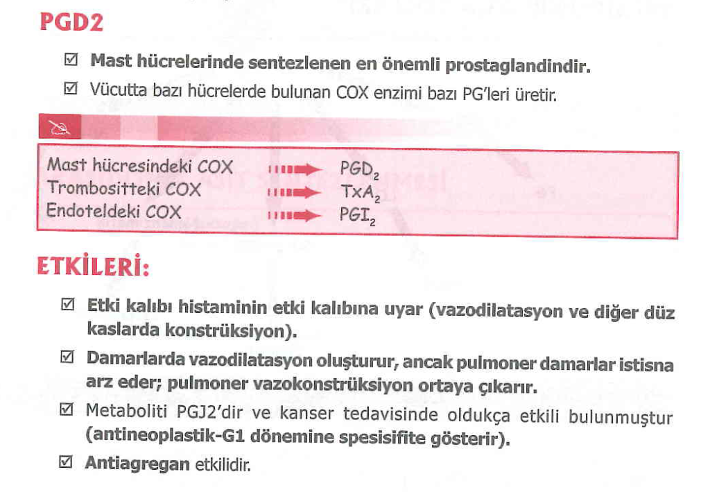 Mast hücreleri tarafından üretilen önemli bir prostaglandindir ; Th2 hücrelerini , eozinofilleri ve bazofilleri toplar . Memeli organlarında büyük miktarlarda PGD2 yalnızca beyinde ve mast hücrelerinde bulunur . Astım gibi alerjik hastalıkların gelişmesinde kritik öneme sahiptir . 1989 yılında yapılan araştırma[3], PGD2’ninniasin(nikotinik asit) alımından sonra vazodilatasyonun (“niasin akışı”) birincil aracısı olduğunu