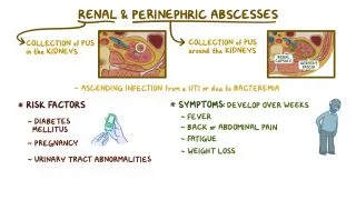 Risk faktörleri : Renal ve perinefrik apseler için predispozan faktörler arasında diyabet, gebelik ve idrar yolu anormallikleri yer alır. Enfeksiyonla komplike olabilen anatomik anormallikler arasında böbrek taşı, özellikle büyük staghorn taşları, vezikoüreteral reflü, nörojenik mesane, obstrüktif tümör, papiller nekroz, iyi huylu kist ve polikistik böbrek hastalığı yer alır