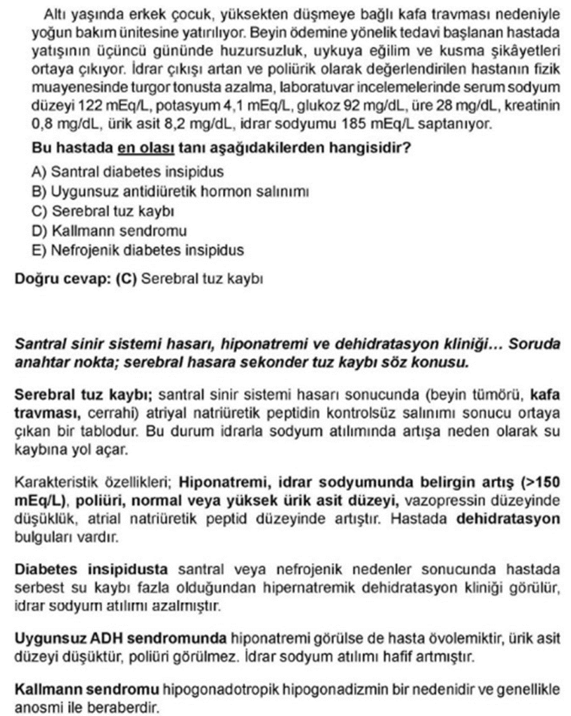 Ensefalit nedeniyle izlenmekte olan 5 yaşındaki çocuk; IV (İntra Venöz) mayi ve antibiyotik tedavisi alırken ve kliniğinde düzelme gözlenirken yapılan elektrolit kontrolünde Na: 115 mEq/dl, K: 2.9 mEq/dl, Cl: 95 mEq/ dL ve BUN: 5 olarak tespit ediliyor. Önceki elektrolit değerleri normal olan hastanın idrar sodyumu 86 mmol/l olarak bulunuyor