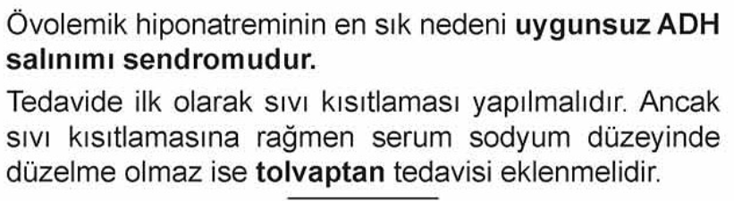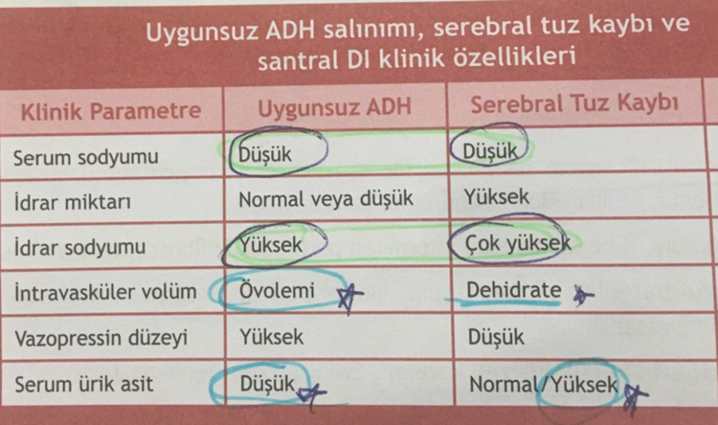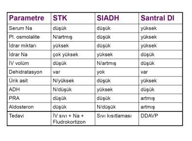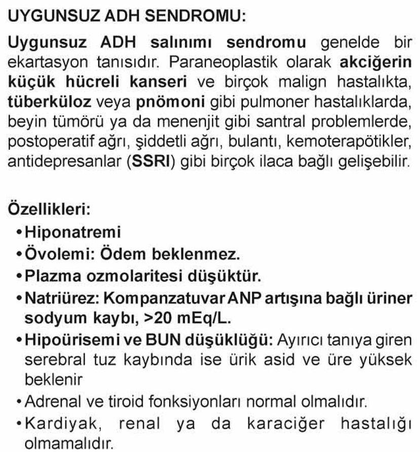 Uygunsuz ADH sendromu; kafa travması ve intrakranial cerrahi, major yanıklar, morfin, NSAİİ kullanımı, hipotiroidizm, küçük hücreli AC Ca gibi nedenlere bağlı olarak gelişebilir.