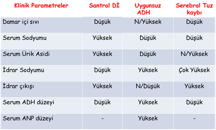 Serebral tuz kaybı, MSS hasarı sonucu ANP artışına bağlı hiponatremi, idrar sodyum artışı, poliüri, vazopressin düşüklüğü ve dehidratasyon bulguları vardır.