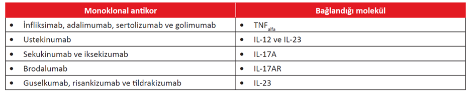 İksekizumab gibi ek monoklonal antikorlar, proinflamatuar sitokinlere karşı geliştirildi ve anti-TNF-α antikorlarından farklı bir noktada inflamatuar yolu inhibe ederler.
