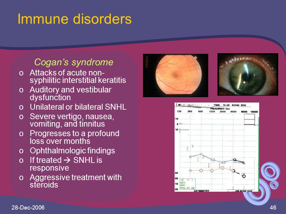 Casoli ve Tumati’nin Sjögren sendromu nedeni ile takip ettikleri bir hastada IgG ve IgM antifosfolipit antikorları yüksek bulunmuş ve hastada 6 yıl sonra Cogan sendromu gelişmiştir. Yapılan temporal kemik incelemelerinde erken dönemde spiral ligamanda plazma hücreleri ve lenfosit infiltrayonu tespit edilmiştir. Ayrıca corti organında dejenerasyon, endolenfatik hidrops ve vestibuler sinirlerde demiyelinizasyon saptanmıştır. Geç dönemde ise endolenfatik hidropsun daha da ağırlaştığı ve yeni kemik oluşumları tespit edilmiştir. Endolenfatik hidrops işitme kaybının temel nedenidir. Eğer tedaviye erken dönemde başlanmazsa koklea ossifiye olabilir ve geri dönüşümsüz işitme kaybı gelişebilir. Hastalığın ilerleyen döneminde vestibüler semptomlar düzelirken, genellikle her iki tarafta işitme azalır ve tipik Cogan sendromunda %54, atipik formda ise %37 sensorinöral işitme kaybı gelişebilir