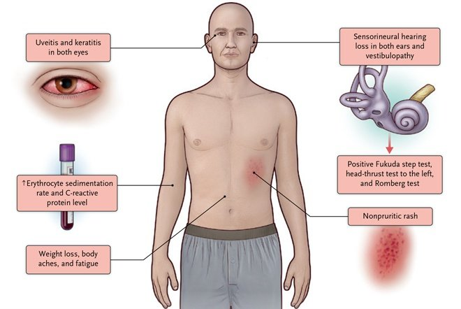 Hastalık genellikle genç erişkinlerde ortaya çıkar. Her iki cinste eşit sıklıkta görülür. Etiyolojide Borrelia ve Klamidya enfeksiyonlarının rol oynadığı düşünülmektedir fakat kesin olarak kanıtlanamamıştır. Hastalığa sistemik vaskülit eşlik edebilir ve özellikle de aort tutulumu sık görülür. Erken dönemde verilen steroid tedavisi göz bulgularını ve işitme kaybını önemli ölçüde azalttığından erken tanı ve tedavi oldukça önemlidir
