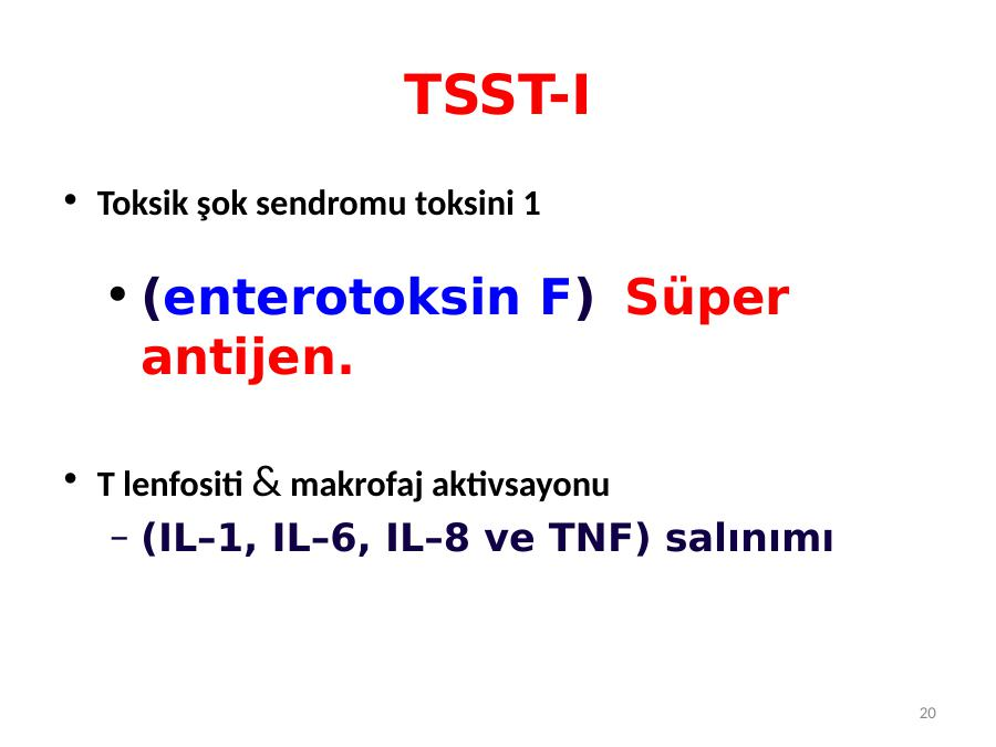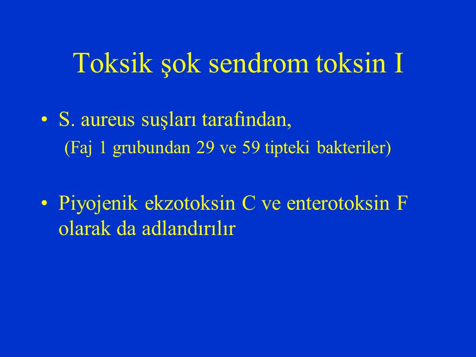 Enterotoksin F yani tSŞT1: düşük mg ortamda nazal ve vajinal tampon kullanıldığında salınır. toksik şok.
