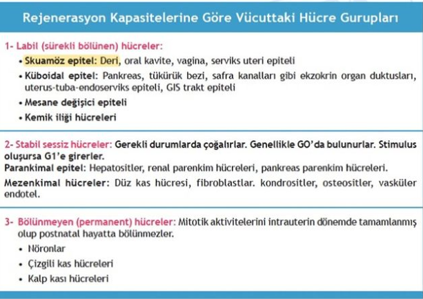 Sürekli bölünen (labil) hücreler: sürekli harap olan hücrenin yerini alırlar. Deri, ağız boşluğu, servix, vajina, dış salgı bezlerin kanal epitelleri (pankreas, tükrük bezi,safra kanalı), sindirim kanalı epiteli.uterus iç yüzeyi, üriner epitel, dalak,lenfoid ve hematopoetik hücrelerdir.Labil hücreler rejenerasyonla iyileşir.