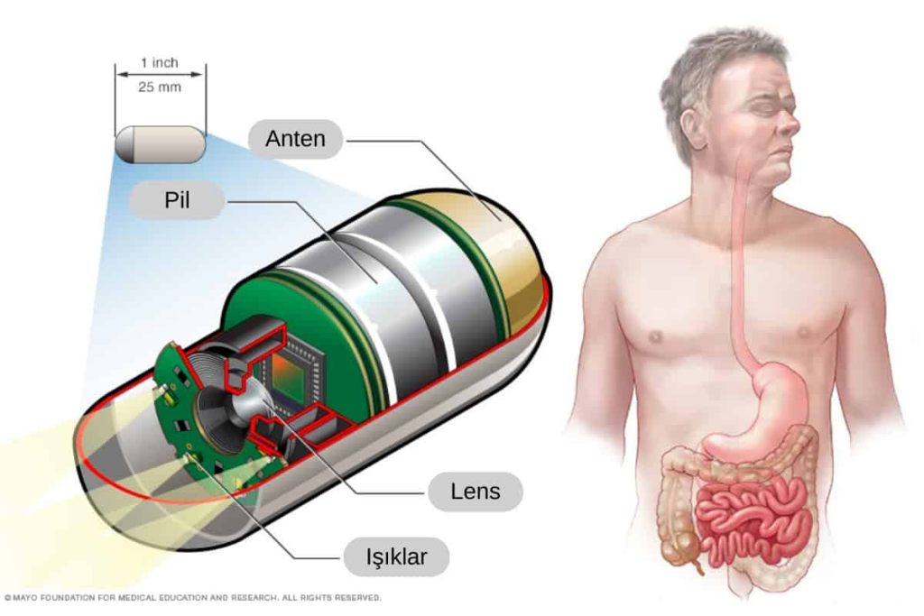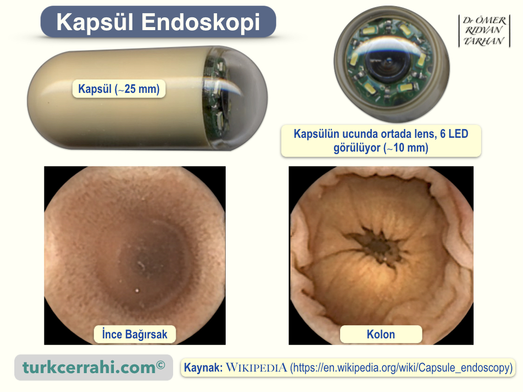 Özofagogastroduodenoskopi (EGD), gastrointestinal sistemin üst kısmını, yani yemek borusunu, mideyi ve duodenum olarak adlandırılan ince bağırsağın ilk bölümünün başlangıcını görüntülemek için uzun esnek bir tüpe bağlı bir kamera ve yerleştirilmiş bir kolonoskop kullanır. rektum yoluyla, kolonu ve ince bağırsağın distal kısmını, terminal ileumu görebilir, ancak bu iki tip endoskopi, ince bağırsağın orta kısmının çoğunluğunu görüntüleyemez. Kapsül endoskopi, gastrointestinal sistemin diğer endoskopi türleriyle görülemeyen kısımlarını incelemek için kullanılır. İnce bağırsakta hastalıktan şüphelenildiğinde faydalıdır ve bazen gastrointestinal kanamanın yerini veya Crohn hastalığı gibi açıklanamayan karın ağrısının nedenini bulmak için kullanılabilir. Ancak, EGD veya kolonoskopiden farklı olarak, keşfedilebilecek patolojileri tedavi etmek için kullanılamaz. Kapsül endoskopi kullanmanın yaygın nedenleri arasında açıklanamayan kanama, demir eksikliği veya karın ağrısı teşhisi, polip, ülser ve ince bağırsak tümörlerinin araştırılması ve inflamatuar bağırsak hastalığı teşhisi yer alır.[2] Minyatür kamera tarafından seans sırasında toplanan görüntüler, uygun frekans bantlarından herhangi biri kullanılarak, hastanın taktığı harici bir alıcıya kablosuz olarak aktarılır. Toplanan görüntüler daha sonra görüntüleme, inceleme ve teşhis için bir bilgisayara aktarılır. İletilen bir radyo frekansı sinyali, kapsülün yerini doğru bir şekilde tahmin etmek ve onu vücut ve gastrointestinal sistem içinde gerçek zamanlı olarak izlemek için kullanılabilir. Kapsül endoskopinin sirozlu hastalarda gastroskopinin yerini alıp alamayacağı belirsizdir.