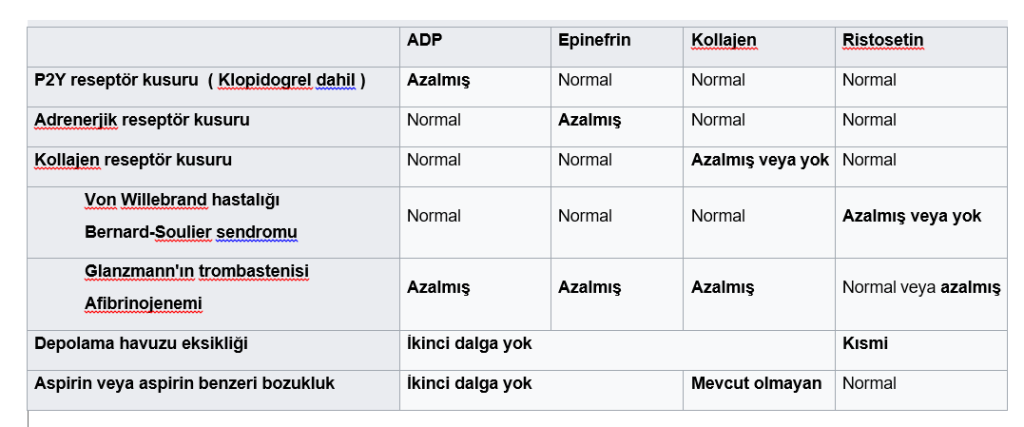 Bozukluklara ve agonistlere göre trombosit agregasyon fonksiyonu