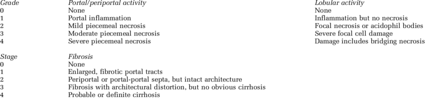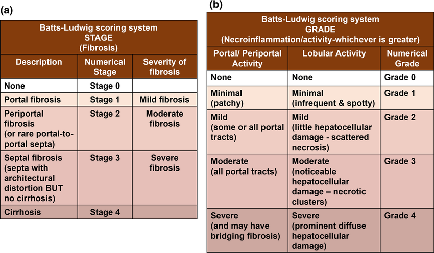 Histopathology stages (by Ludwig and Scheuer systems)