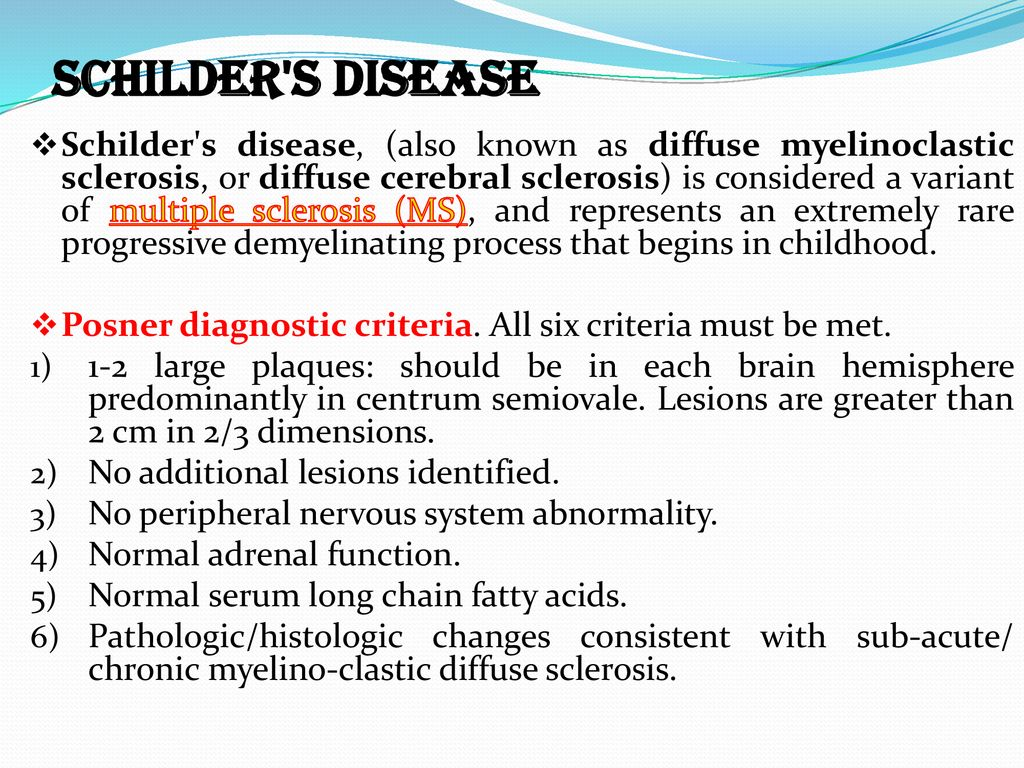 Schilder sklerozunda tipik demiyelinizan plaklar genellikle iki taraflı olarak centrum semiovale’de bulunur. Her iki yarıküre de neredeyse tamamen büyük, iyi tanımlanmış lezyonlarla kaplıdır. Schilder sklerozunda bu tür plaklar büyük oranda görülse de daha küçük lezyonlar da görülebilir.