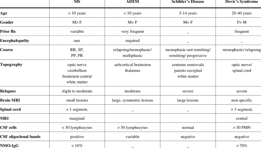 Bu hastalık , multipl sklerozun sınır formlarından biri olarak kabul edilir çünkü bazı yazarlar bunları farklı hastalıklar, diğerleri ise MS varyantları olarak kabul eder. Bu gruptaki diğer hastalıklar nöromiyelitis optika (NMO), Balo konsantrik skleroz ve Marburg multipl sklerozdur .