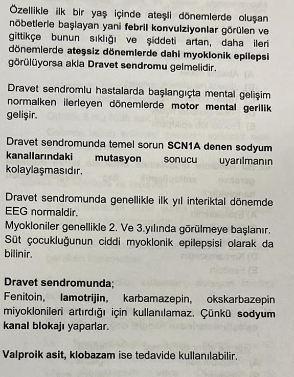 Dravet Sendromu: Dravet sendromu (DS) ilk defa 1978 yılında Charlotte Dravet tarafından tanımlanmış süt çocukluğu döneminde uzun süren febril veya afebril jeneralize ya da fokal nöbetler ile başlayan, zamanla dirençli nöbetlerin geliştiği, nörolojik ve kognitif gelişimde gerilemeye neden olan epileptik sendromdur. İnsidansının 1/20.000-1/40.000 olduğu tahmin edilmektedir.