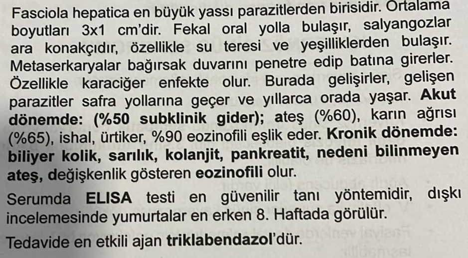 İnfekte hayvan karaciğeri yendiğinde de dışkıda yumurta görülebileceği unutulmamalıdır (yalancı parazit).
