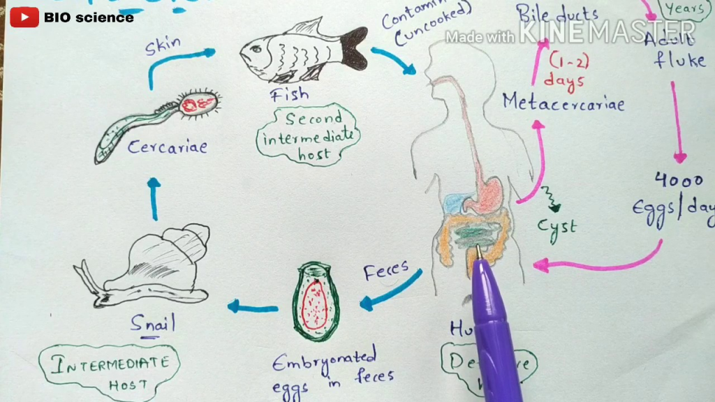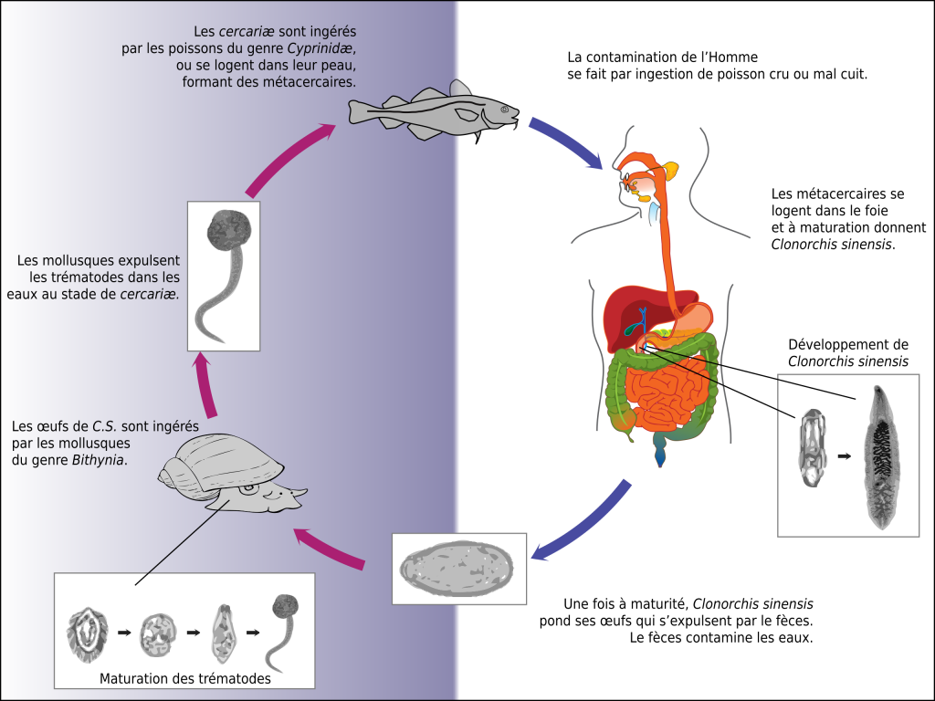 İnsanlara çiğ veya az pişmiş balıkların tüketilmesiyle bulaşır. Genç parazitler safra kanallarına akıntıya karşı ulaşarak küçük hepatik kanallara , daha nadiren de pankreastaki kanallara kesin olarak yerleşirler4 . Büyük karaciğer parazitinin aksine , bu parazitler peritona veya hepatik parankim yoluyla göç etmezler , hepato-safra yollarında 2 kalırlar , bu da başlangıç aşamasında semptomların varlığını veya yokluğunu açıklar.