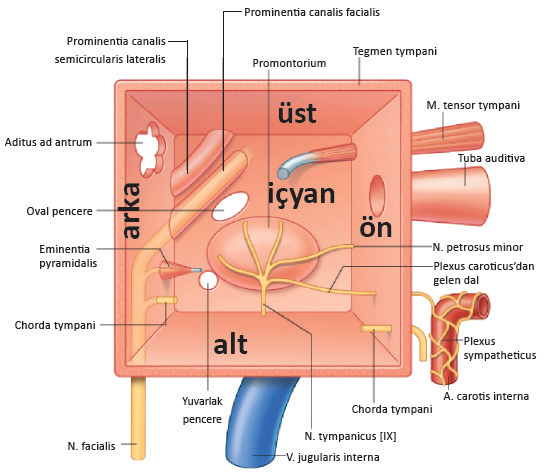 3-İç yan (paries labyrinthus): Fenestra ovale, fenestra rotundum, promontorium, n. tympanicus (IX), membrana tympani secundaria.