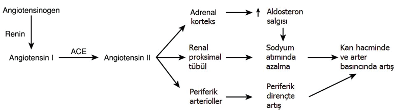 Renin böbreklerde jukstaglomerüler hücreler tarafından salgılanan bir asit proteazdır. Bilinen tek görevi anjiotensinojen’den angiotensin I oluşturmaktır. Anjiotensinojen karaciğerde sentezlenen bir a2-globulindir. Dolaşımdaki anjiotensinojen miktarları glukokortikoidler, tiroid hormonları, östrojenler, birçok sitokinler ve anjiotensin II tarafından artırılır.