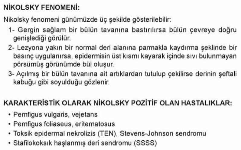 Nikolsky Fenomeni: Akantolizisi gösterir. Pemfigus vulgaris, foliaseus, vejetans, eritematosus, Epidermolizis bülloza (Sadece simpleks tipinde pozitif), Nikolsky işareti pozitif olan subepidermal büllöz hastalık TEN(psödo-nikolsky), Stevens-Johnson Sendromu SSSS(stafilokoksik haşlanmış deri sendromu), Sistemik yanıklarda görülür.