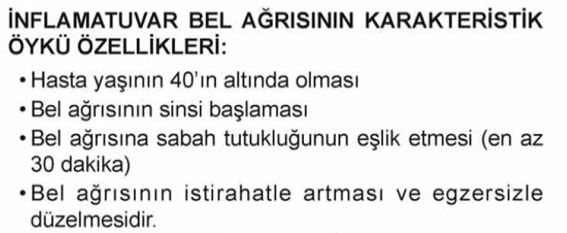 • Egzersiz ile rahatlayan İnflamatuar bel ağrısının iyi sorgulanması ve tanınması önemlidir.