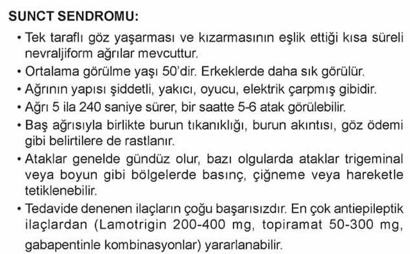 Beyin görüntülemesi ile sekonder SUNCT nedenleri (Posterior fossa ve hipofiz bezi tümörleri gibi) dışlanmalıdır.