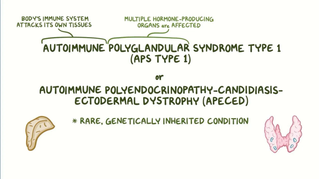 1-Otoimmün poliendokrin sendromu tip 1 , AIRE geninin mutasyonuna bağlı olarak hipoparatiroidizm , adrenal yetmezlik , hipogonadizm , vitiligo , kandidiyaz ve diğerleriyle sonuçlanan otozomal resesif bir sendromdur.