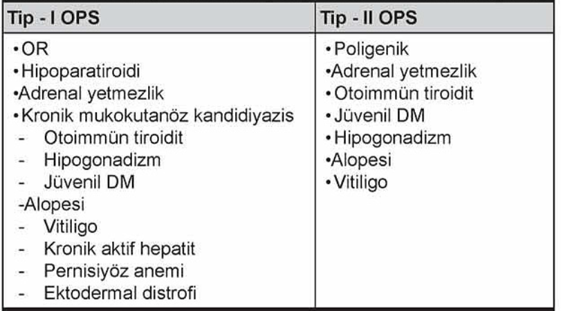OPS tip 1 çocukluk yaş grubunda görülür ve hipoparatiroidi, addison hastalığı ve cilt/mukozaları tutan kandida infeksiyonu varlığı ile tanı konulur. OPS tip 2 ise daha sık görülür ve bazı bozuklukların çakışmasını içerir.