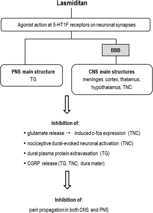 Lasmiditan, yeni bir 5-HT1F reseptor agonisti ilactır ve geriye kalan 5-HT reseptorlerine afinitesi cok azdır. Triptanlardaki vazokonstruksiyon etkisi bulunmadığından dolayı, daha iyi bir kardiyovaskuler guvenlik profiline sahiptir. Migren ağrısının temelini oluşturan sebeplerden biri olduğu duşunulen Trigeminal sinir uyarımı ile induklenen dural damarlardaki plazma ve plazma protein ekstravazasyonunu azaltarak etki gosterir.