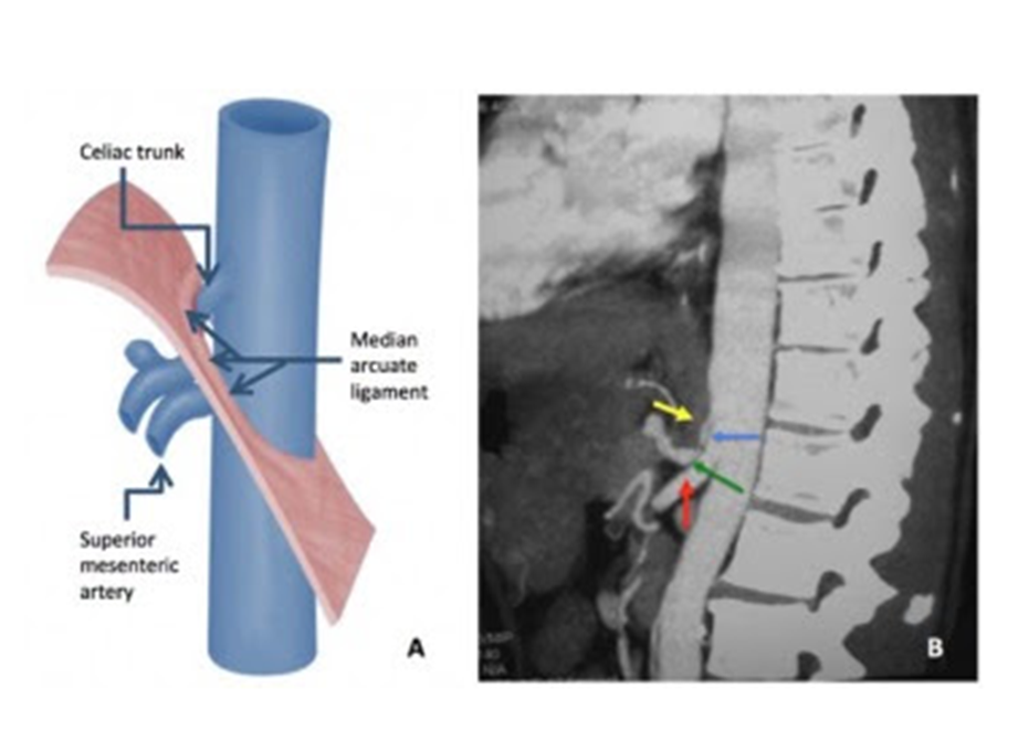 Ligamentum arcuatum medianum nadren truncus coelacus’a yaptığı bası sonucu iskemik semptomlarla kendini gösteren çölyak aksis kompresyon sendromuna (medyan arkuat lgaman sendromu ya da Dunbar sendromu) neden olur. Bu sendrom özellikle orta-genç yaş hastalarda görülür ve çoğunlukla yemek sonrasında eksprasyon ile artan epigastrk ağrı, klo kaybı, abdominal rahatsızlık hissi gibi bulgularla kendini gösterir.