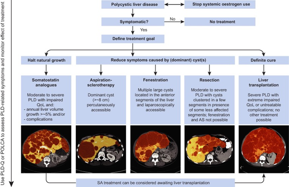 Polikistik Karaciğer Hastalığı bulunan ve Semptom (+) hastada somatostatin analoğu olarak “lanreotide” ve mTOR inhibitörü olarak da “everolimus” başlama kriteri aşağıdakilerden hangisidir?