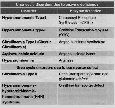 Üre döngüsü bozuklukları (UCD’ler), üre döngüsü yolunun altı enziminden (CPS1, OTC , ASS1, ASL , ARG1, NAGS) veya iki taşıyıcısından (ORNT1 veya sitrin) herhangi birindeki kalıtsal eksikliklerden kaynaklanır . Üre döngüsü kusurunun ciddiyeti, kusurlu proteinin yoldaki konumundan etkilenir. Şiddetli üre döngüsü bozukluğu olan bebeklerde doğumda semptom görülmez , ancak hızla serebral ödem , uyuşukluk, anoreksi, hiper veya hipoventilasyon, hipotermi, nöbetler , nörolojik duruş ve koma gelişir. Kısmi üre döngüsü enzim eksikliklerinde, ameliyat, uzun süreli açlık, tatil, peripartum dönem, daha yüksek protein alımını içeren basit beslenme değişiklikleri , tedavi (kortikosteroidler, valproat asit) gibi bir hastalık veya stres gibi yaşamın herhangi bir döneminde amonyak birikimi tetiklenebilir. plazma amonyak konsantrasyonunda çok sayıda hafif yükselmeye neden olur. Neredeyse her zaman baş ağrısı, konfüzyon, konvülsiyonlar, ataksi, ajitasyon ve gastrointestinal semptomların (mide bulantısı, kusma ve karın ağrısı) eşlik ettiği uyku bozuklukları, sanrılar, halüsinasyonlar ve psikoz ortaya çıkabilir.