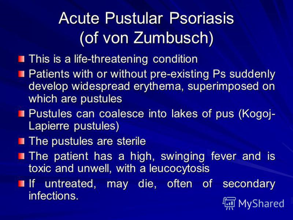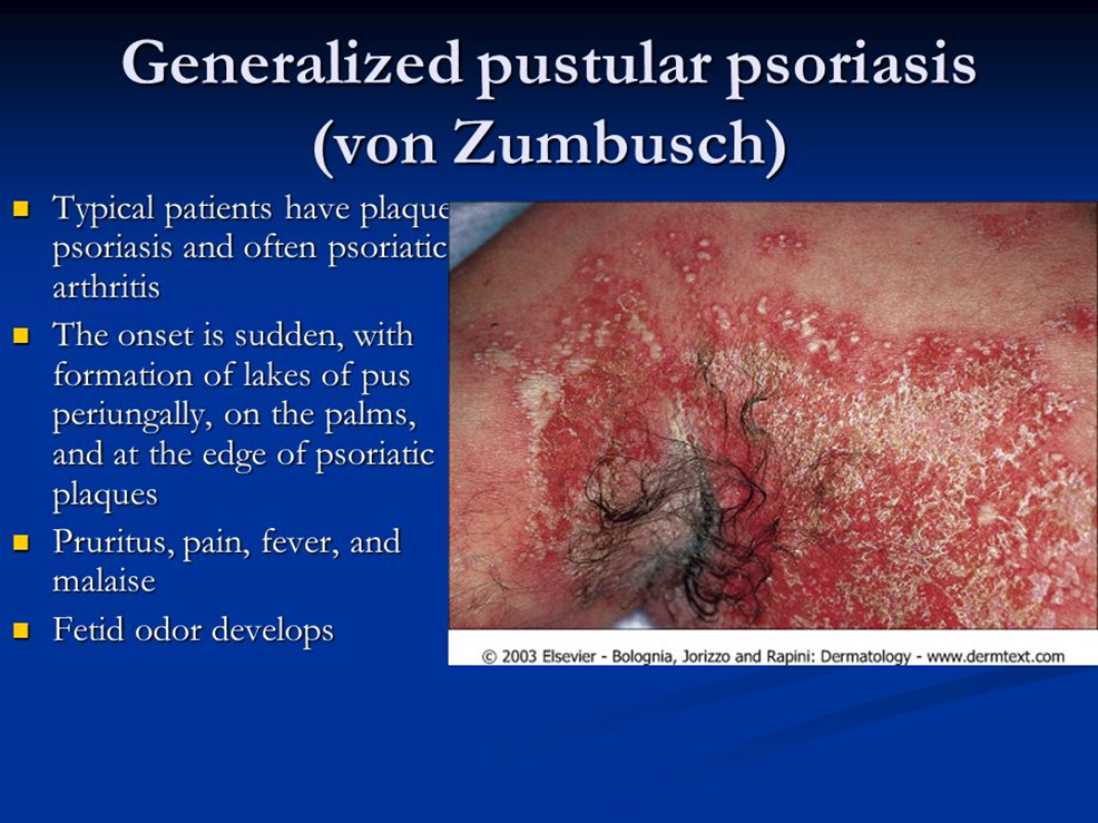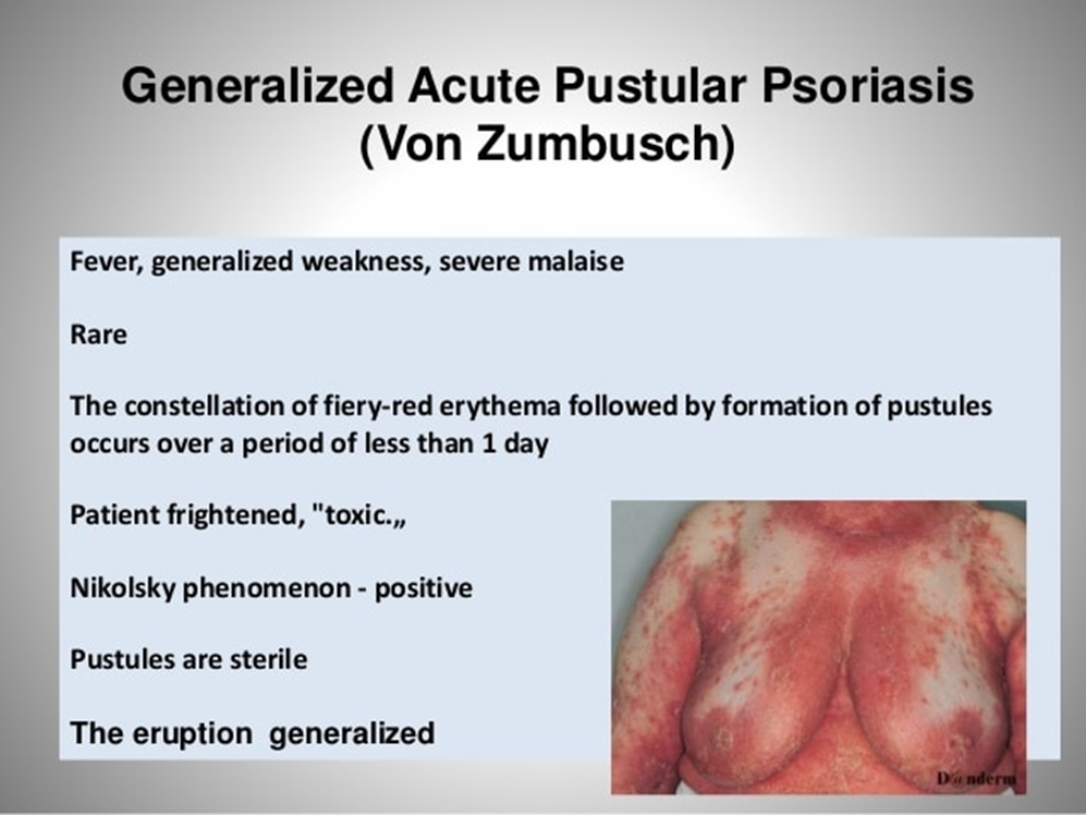 b. Generalize pustuler psoriazis (von zumbusch hastalığı): Deri bulguları ile beraber ağır sistemik bulgularla (ateş, atralji vb) seyreder. Steril pustullerle seyreder. Pustuller ağrılıdır. Generalize olup yuksek ateş ve lokosi–toza neden olabilir. Genellikle 3. trimesterde görülen gebelikteki pustuler psoriazise impedigo herpetiformis denir.