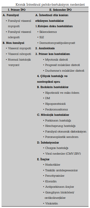 İPO primer hastalık olarak görülebileceği gibi barsak motilitesini değiştiren geçici veya kalıcı olabilen çok sayıda duruma sekonder de olabilir, intestinal nöropati veya miyopatiye yol açan bir çok patolojik durum psödo-obstrüksiyona neden olur.