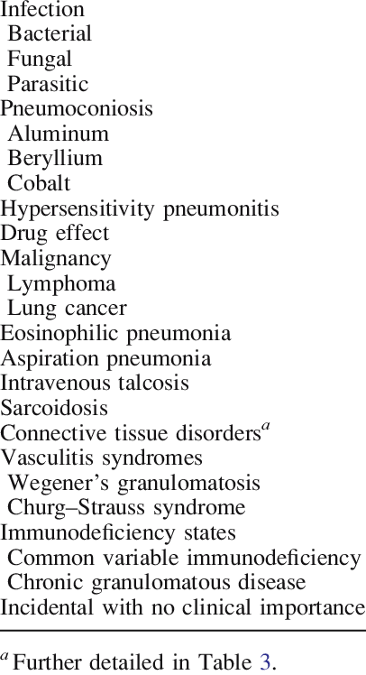 Sarkoidozis, Berilyozis, Crohn hastalığı ve Schistozomiazis gibi parazitozlardır. Hipersensitivite pnömonisinde de gecikmiş tipte aşırı duyarlık reaksiyonları tabloya eklenir ve intestisyel alanı tutan granülomlar görülür.