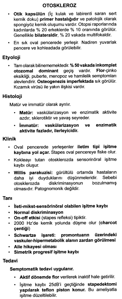 Klinik oval pencerede yerleşenler başlangıçta iletim tipi işitme kaybı ilerleyen dönemlerde sensoryal işitme kaybına neden olur. Stapes tabanı oval pencereye fıkse olur. Kokleayı tutan otoskleroz sensorinoral işitme kaybına yol açar.