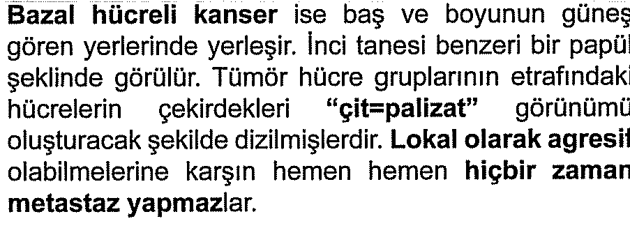 Epidermis bazal hücrelerinden veya kıl folliküllerinden gelişir. Beyazlarda en sık görülen malign deri tümörüdür.
