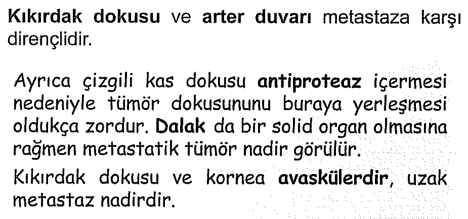 Tümörün invazyonu sonucu oluşacak metastaza dirençli dokular, kıkırdak, arter duvarı, çizgili kas dokusu, dalak, korneadır 13 Mart 2024 yazar drtanjuy