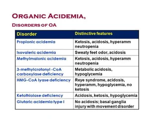 Organik acidemi, normal amino asit metabolizmasını , özellikle de dallı zincirli amino asitleri bozan ve genellikle mevcut olmayan asitlerin birikmesine neden olan bir grup metabolik bozukluğu sınıflandırmak için kullanılan bir terimdir.