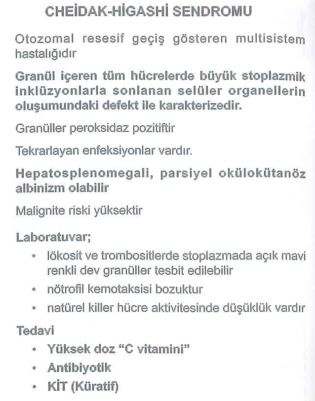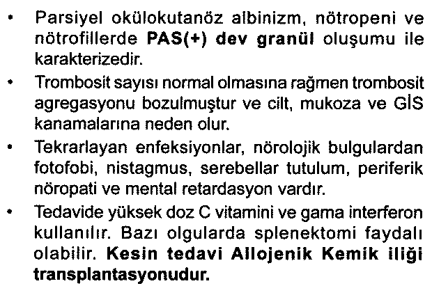 Nötrofiller ve diğer lökositlerde sitoplazmada dev granüller bulunur. Bu hastalıkta fagositik vakuollere lizozomal enzimlerin transferi bozulur (fagolizozom defekti), enfeksiyonlara duyarlılık gelişir, melanositlerde azalma (albinizm), MSS hücrelerinde ve trombositlerde defekt (kanama bozukluğu) saptanır