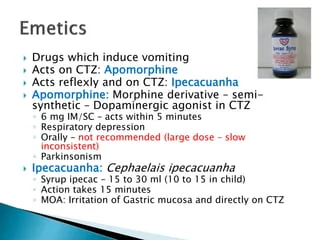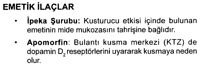 1-İpeka şurubu gibi bir kusturucu , ağızdan veya enjeksiyonla uygulandığında kusmaya neden olan bir maddedir. Bir madde yutulduğunda ve vücuttan derhal atılması gerektiğinde kusturucu tıbbi olarak kullanılır. (Bu nedenle, fare zehiri gibi birçok toksik ve kolayca sindirilebilen ürün kusturucu içerir. Kemirgenler kusamadığı için bu durum, kemirgen öldürücünün etkinliği açısından bir sorun oluşturmaz.) Kusmanın tetiklenmesi, maddenin daha önce uzaklaştırılmasını sağlayabilir.