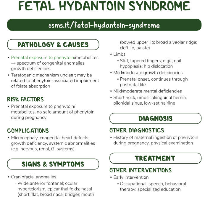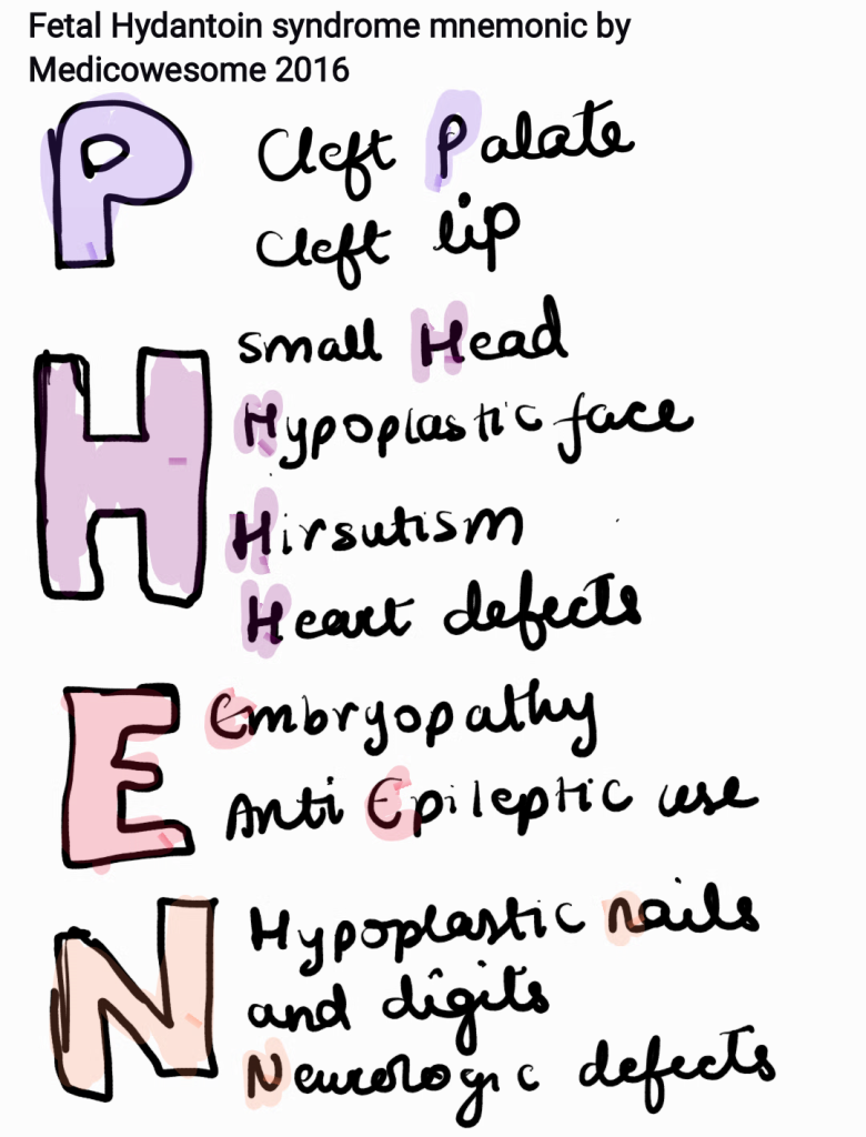 Fenitoin ve diğer antiepileptiklerin neden olduğu spesifik sendromların prevalansını azaltmak için gebelikte mümkün olduğunca antiepileptik kullanımından kaçınılmalı, mümkün değilse en düşük dozda en az teratojen olanlar seçilmelidir. Aile, sahip olabileceği bebek konusunda bilgilendirilmelidir.