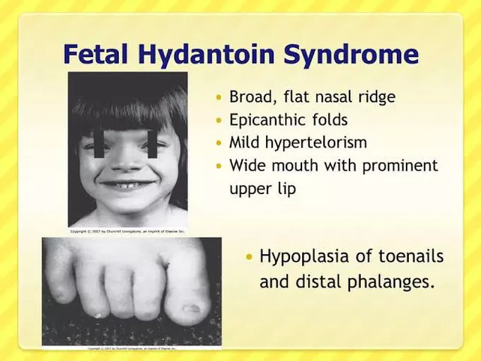 Fetal hidantoin sendromunun karakteristik bulguları; mikrosefali, kraniofasial anomaliler, kardiyak defektler, ürogenital malformasyonlar, hipoplastik distal falanks ve tırnakları içermektedir. Ayrıca antiepileptik kullanımı folat seviyelerini düşürdüğünden özellikle nöral tüp defekti riskinde artış vardır.